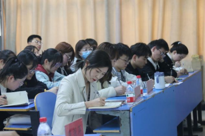 (图为十大外围足球平台官网 分团委副书记高宇现场听取学生述职)