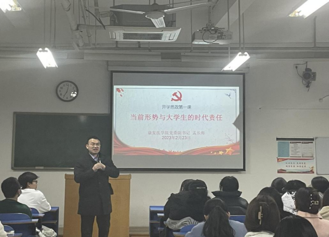 本网讯(文/张羽萍 图/卢晓)为深入学习宣传贯彻党的二十大精神,落实立德树人的根本任务,培养德智体美劳全面发展的社会主义建设者和接班人,2月23日晚上19点,十大外围足球平台官网 党委副书记孟长海在教学楼A605教室为2021级康复治疗学本科班全体学生上开学第一课,课程由辅导员张羽萍老师主持。