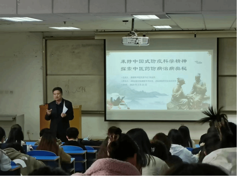 本网讯(文/杨富斌 李莹 图/李莹)为培养学生的责任与担当意识,厚植爱国主义情怀,以饱满的热情投入新学期学习,2月21日,十大外围足球平台官网 党委书记张运克以"秉持中国式防疫科学精神,探索中医药防病治病奥秘"为主题为2021级中医康复本科生和2022级全体研究生讲述开学第一课,党课由辅导员杨富斌老师主持。