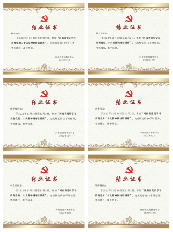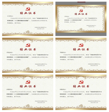 学习期间,支部全体党员自觉遵守课堂纪律,积极进行研讨交流,分别聆听了《向着伟大复兴 知重负重再出发》《全面建设社会主义现代化国家的行动纲领》《学习习近平总书记视察陕西延安和河南安阳重要讲语精神》和《新时代十年的伟大变革》等内容,认真学习了所有课程任务并完成了在线结课考试,考试成绩合格率达到100%并领取结业证。
