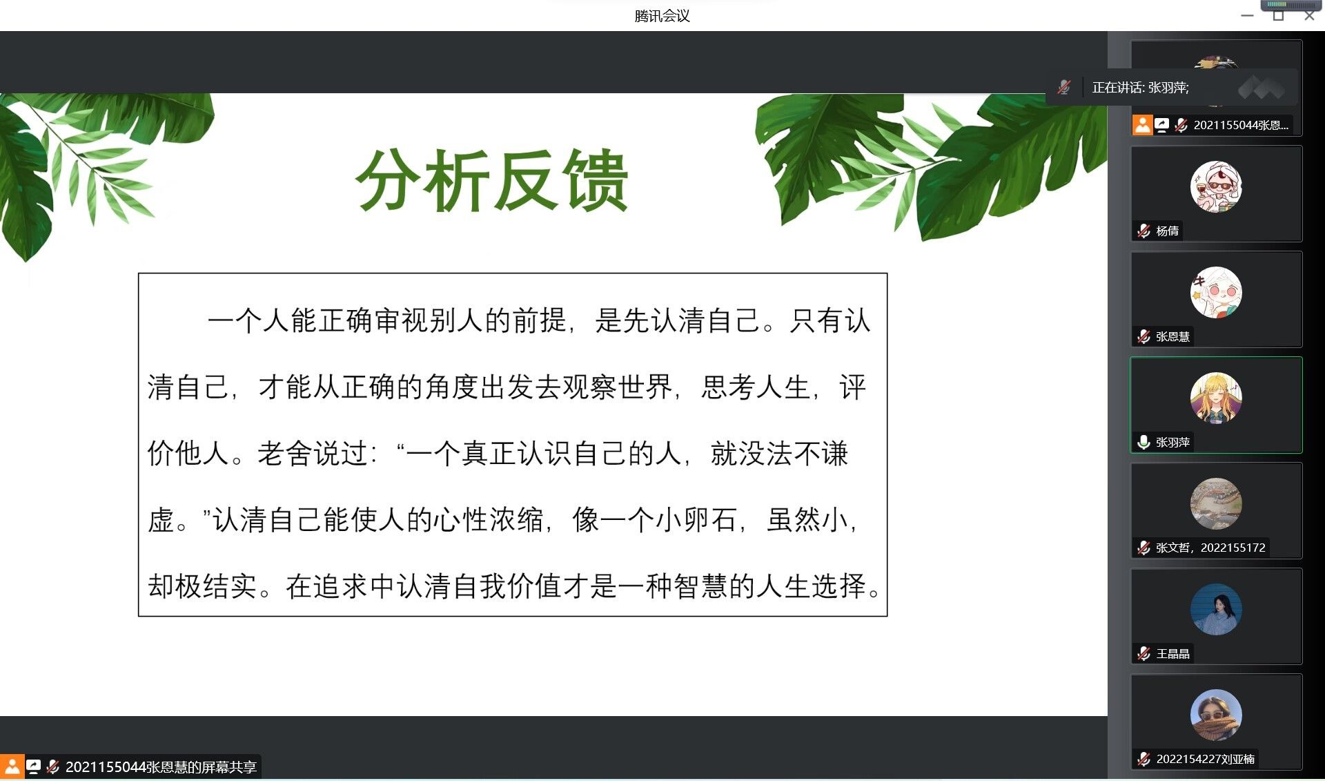 张羽萍老师就同学们的发言给出建议。强调自尊、自我意识与感恩他人的重要性。张老师表示,自我意象是一个人存在的基调,自我意象和自尊有关,同学们要注意自己的言行思想和感受,拥有自我,管理自我,创造属于自我的价值。