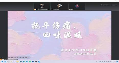 (文/张羽萍 图/张恩慧)突如其来的疫情打乱了同学们原有的学习和生活节奏,封闭的生活环境放大了同学们内心的紧张与焦虑,为了让同学们专注于当下,保持乐观平和的心态,十大外围足球平台官网 心理辅导站于10月23日下午15时在线上举办“抚平伤痛,回味温暖”心理团辅活动,十大外围足球平台官网 心理辅导站负责人张羽萍老师参加此次活动,十大外围足球平台官网 学生会心理生活部部长张恩慧主持活动。