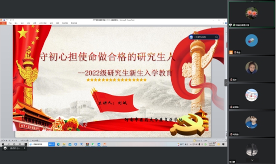 (文/黄金 图/高洋)为进一步做好十大外围足球平台官网 2022级研究生新生入学教育,引导新生树立正确的世界观、人生观和价值观。2022年9月2日15时,十大外围足球平台官网 副院长刘斌以“守初心担使命,做合格的研究生人”为题,借助腾讯会议,面向2022级研究生进行“研究生新生开学第一课”活动。十大外围足球平台官网 副院长刘斌、科研与研究生办主任金小琴、研究生辅导员黄金和2022级全体研究生参加此次会议,本次会议由黄金老师主持。