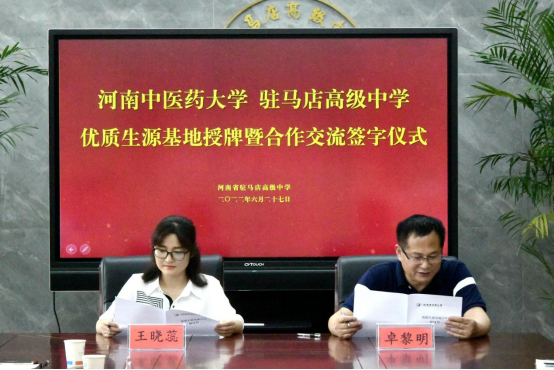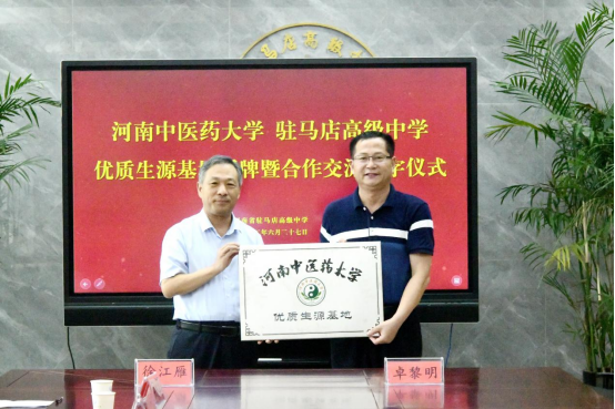 驻马店高级中学始于1927年,是驻马店市直属普通高中,也是河南省首批示范性高中、河南省普通高中多样化发展示范校、全国青少年人工智能活动特色单位、河南省文明校园。我校和驻马店高级中学“优质生源基地”签约挂牌,对进一步促进双方中医药文化交流、提升我校生源质量起到积极作用,有助于共同为中医药事业发展输送更多优秀人才,为中医药的振兴发展做出更大贡献。