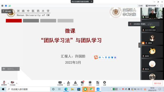 本网讯(文/张羽萍 图/卫平平)按照学院党委开学第一课的安排,2022年3月19日下午19:00,十大外围足球平台官网 副院长许国防以腾讯会议形式,以“团队学习法”与团队学习微课为题为同学们上开学思政第一课,十大外围足球平台官网 2019级中医康复学本科班、2020级康复治疗学本科班的全体学生参加了学习。