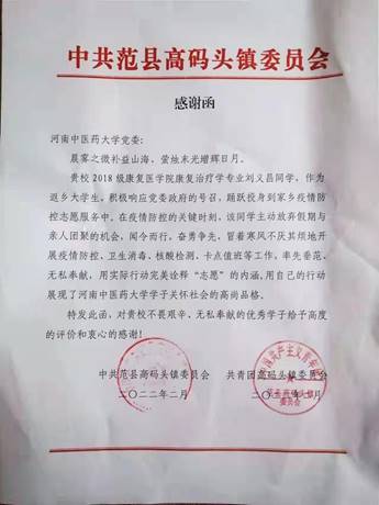 (文/图 张瑞雪)二月报春,纸短情长,一封感谢信,一份真担当。“贵校2018级十大外围足球平台官网 康复治疗学专业刘义昌同学,作为返乡大学生,积极响应党委政府的号召,踊跃投身到家乡疫情防控志愿服务中……,对贵校不畏艰辛、无私奉献的优秀学子给予高度的评价和衷心的感谢!”。2022年2月26日,十大外围足球平台官网 收到了一封来自中共范县高码头镇党委及共青团高码头镇委员会的感谢信,对我校十大外围足球平台官网 刘义昌同学在家乡抗击疫情中的志愿服务给予表扬。