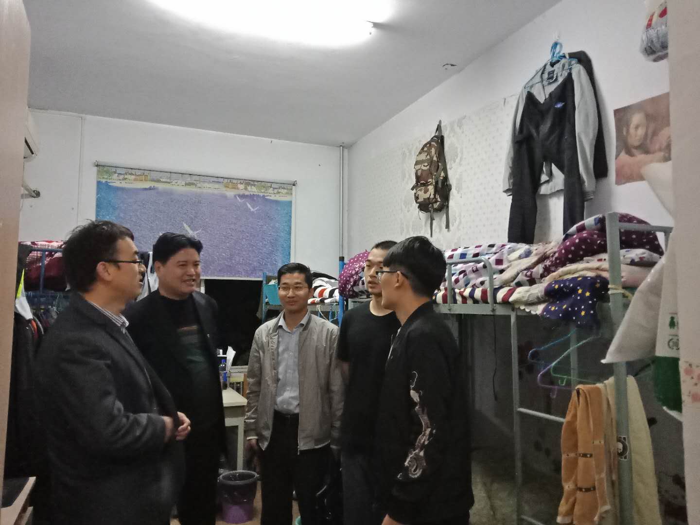 为贯彻落实学校及十大外围足球平台官网 秋季学期安全教育工作安排,2018年10月22日晚八点,十大外围足球平台官网 党委书记张运克、副书记孟长海带领2015级康复治疗学本科毕业班辅导员姚明超和学生党员深入东明校区学生宿舍,开展全面细致的实习生安全检查。