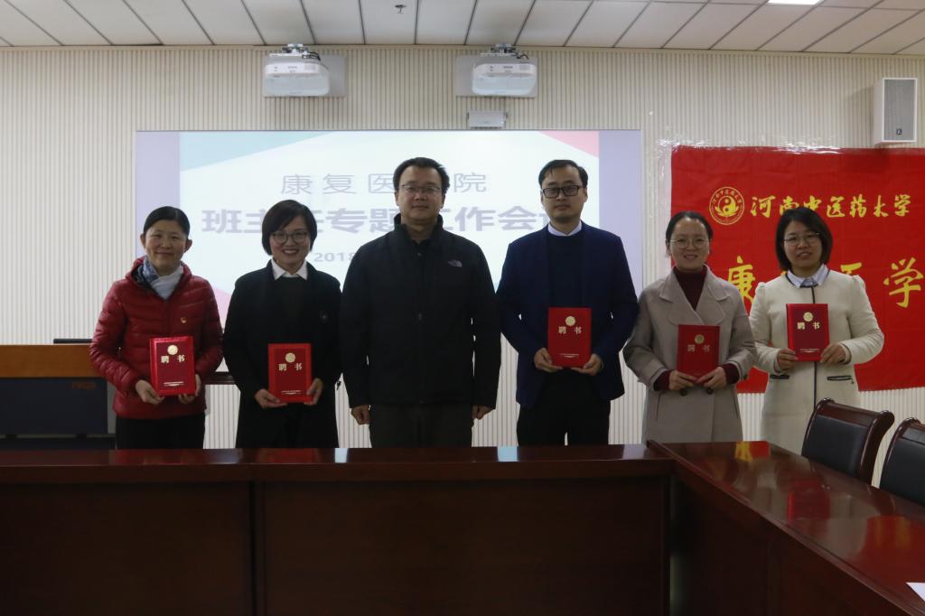 会议伊始,由学工办副主任唐瑞就2018年日常管理、学生资助、心理健康、招生就业四个方面汇报学生工作情况。分团委副书记姚明超对共青团和学生党支部工作进行汇报,着重介绍党建带团建、星光研习社、志愿服务、挑战杯等活动开展情况。在班主任聘任和工作交流环节,副院长冯晓东向组织部副部长马赟、省中医院康复科李彦杰主任等班主任颁发聘书,班主任代表马赟、张雅素、王欣雨、高玲莉分享了学生工作经验和体会。大家纷纷表示,在今后的班主任工作中,将发挥专业所长,积极配合院部,以立德树人为根本任务,引导学生成长成才。