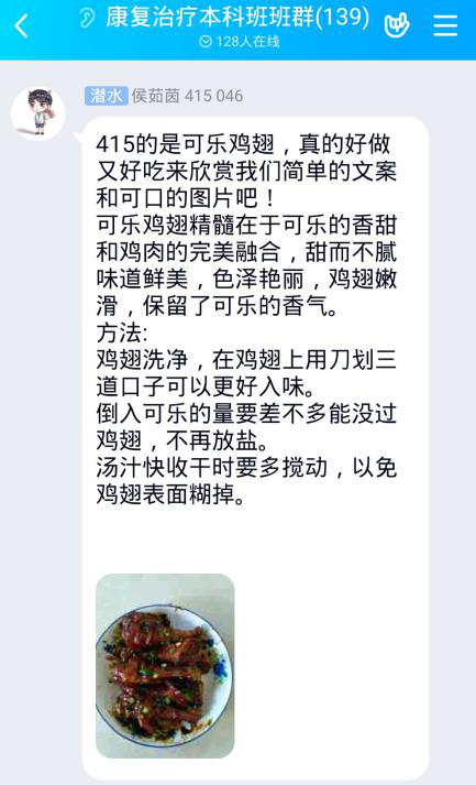 当前抗击疫情到了关键期,为更好的做好抗疫斗争,十大外围足球平台官网 大学生按照学校安排留在家中认真上网课。为进一步丰富业余生活,活跃学习氛围,3月5日晚上,十大外围足球平台官网 2018级康复治疗学本科班学生在微信群里举办了“分享身边的美食”活动。
