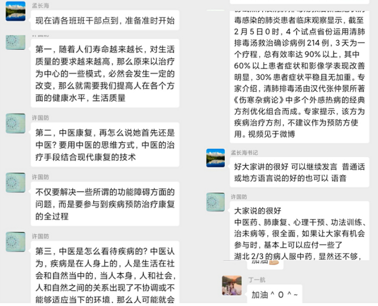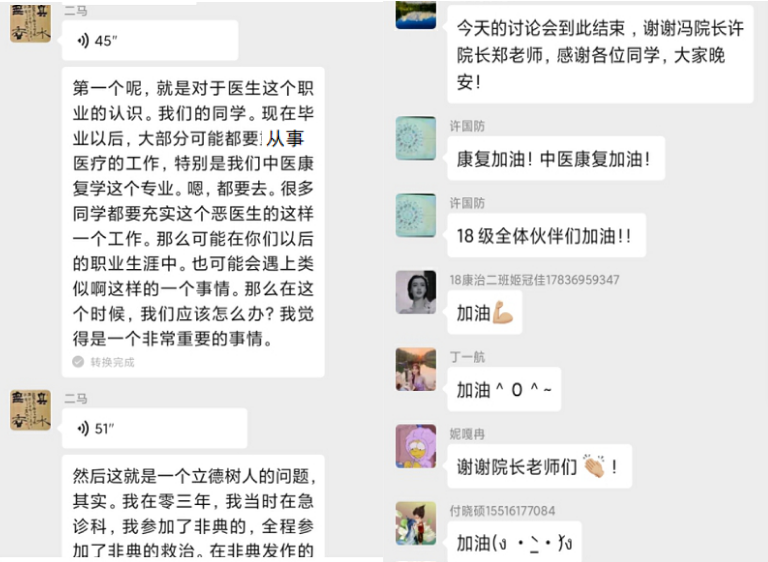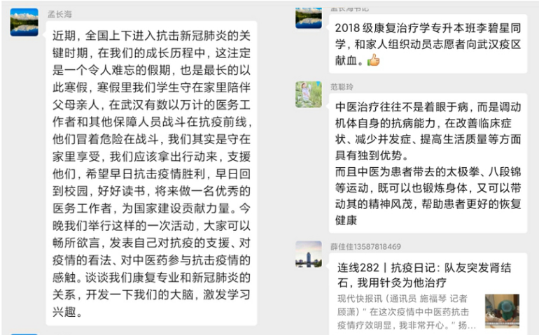 面对新冠肺炎疫情的肆虐,为进一步落实我校新冠肺炎疫情防控工作的方案和要求,做好学生方面疫情联防联控工作,十大外围足球平台官网 于2月21日19:30——21:00在2018级疫情防控工作群中举行了“声援抗疫新冠肺炎与康复医学”的讨论活动。十大外围足球平台官网 副院长冯晓东、党委副书记孟长海、副院长许国防和班主任郑婕、郭宇、程雪老师与2018级全体同学在线互动。