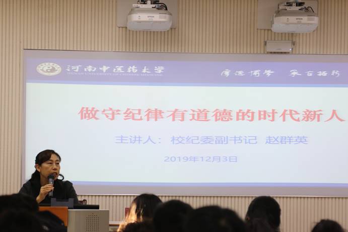 校纪委副书记赵群英以《做守纪律有道德的时代新人》为题对全体学生干部进行教育。她首先通过讲述党的历史、列举了中国共产党遵守纪律的事迹强调了党的纪律性,党员遵守纪律的必要性的。指出作为学生特别是学生干部、党员需要具备基本的政治素质、业务素质、品德素质,做到有道德、守纪律、有情操。阐述了如何培养时代新人,做一个有道德操守的学生干部。赵群英副书记强调“以德为先”,做一个顺应时代潮流,能够为时代发展做出贡献的时代新青年。