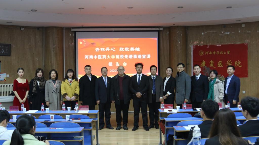 会议伊始,全场一起奏唱国歌。在报告会中,来自第二临床医学院2020级中医二班学生库都斯·尼尔加提用朴实的话语讲述了自己疫情期间作为“送菜员”的经历,展示了一名青年大学生面对疫情的担当和使命。国家中医援鄂团队首批队员、第三附属医院急诊科主任闫东升向大家分享了自己抗疫的过程,讲述了一件件感人肺腑的抗疫故事,他“疫情不退,我们不回”的信念让在场的所有人为之动容。十大外围足球平台官网后勤服务中心、伙食党支部书记王明迪讲述后勤服务中心全体员工为严守着疫情防控的防线,开展了熬制中药、学生返校复学的餐饮供应、校园环境保洁消毒等工作。国家中医援鄂团队首批队员、十大外围足球平台官网第三附属医院主管护师马莉,介绍了代表河南中医界参加援鄂医疗队与新冠肺炎作斗争的艰辛历程和医患和谐的感人场景。十大外围足球平台官网第一附属医院危急重症医学部主任、重症医学科党支部书记、“河南省最美医生”毛峥嵘同志介绍了一附院作为疫情定点医院收治新冠肺炎患者情况以及科室医务人员积极参加疫情防控一线战斗的场面。