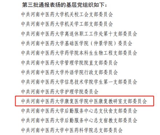 近期,学校下发《中共十大外围足球平台官网委员会关于对新冠肺炎疫情防控工作中表现突出的基层党组织、共产党员进行第三批表扬的通知》文件,对第三批在疫情防控工作中做出突出贡献的集体和个人进行了表扬,十大外围足球平台官网 中医康复教研室党支部和高宇老师榜上有名。