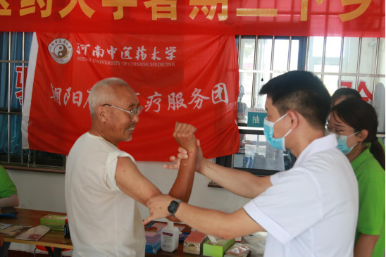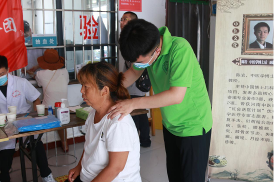 上午九点半,义诊正式开始,炎炎烈日下的义诊现场气氛十分火热,前来就诊的村民络绎不绝。陈岩博士带领义诊小分队为村民进行测量血压、贴耳穴贴等治疗,让村民们切实地体验到专业的医疗服务。经过陈岩博士的答疑解惑和耐心诊治后,前来就诊的村民们脸上洋溢出满意的笑容。义诊在热火朝天进行的同时,服务团其他成员向村民发放健康知识指导手册和宣传教育资料、提供健康咨询等指导,进而增强基层群众的自我保健和防护意识。