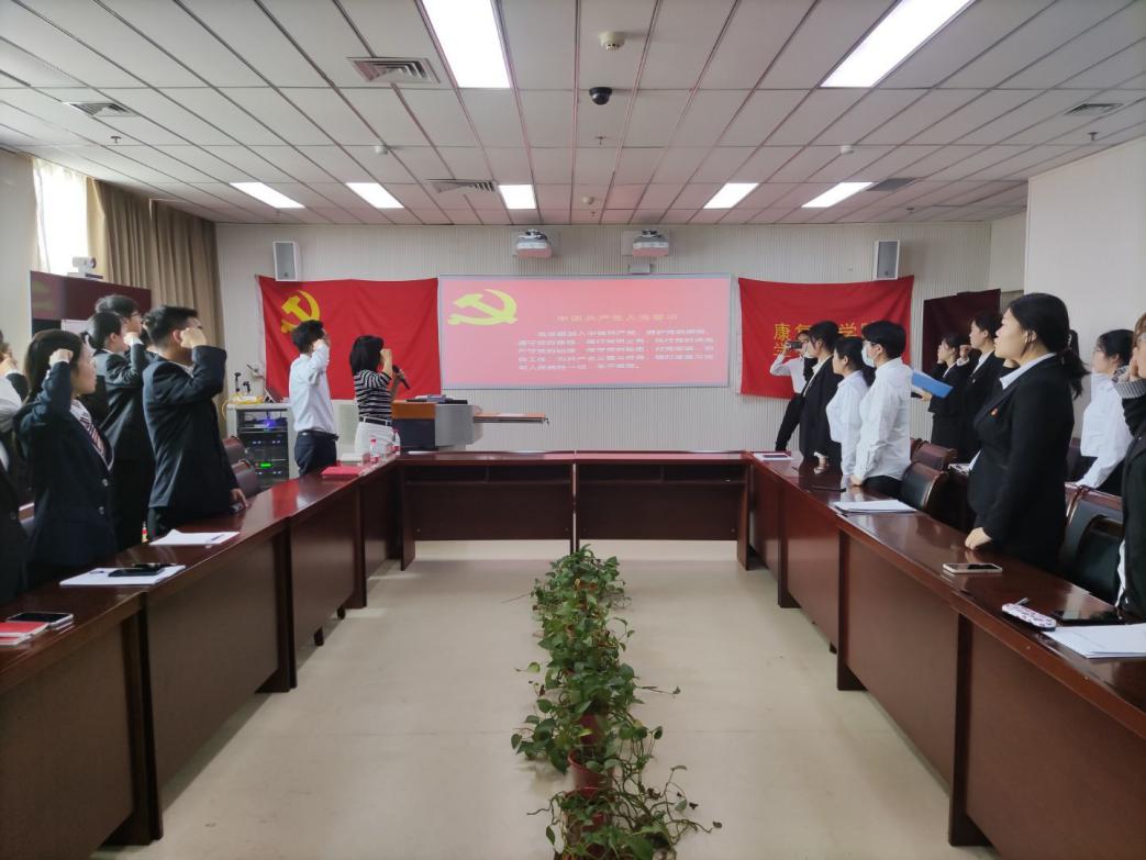 会议进行第三阶段,由学生第二党支部书记唐瑞同志带领全体党员面向党旗进行了入党宣誓。