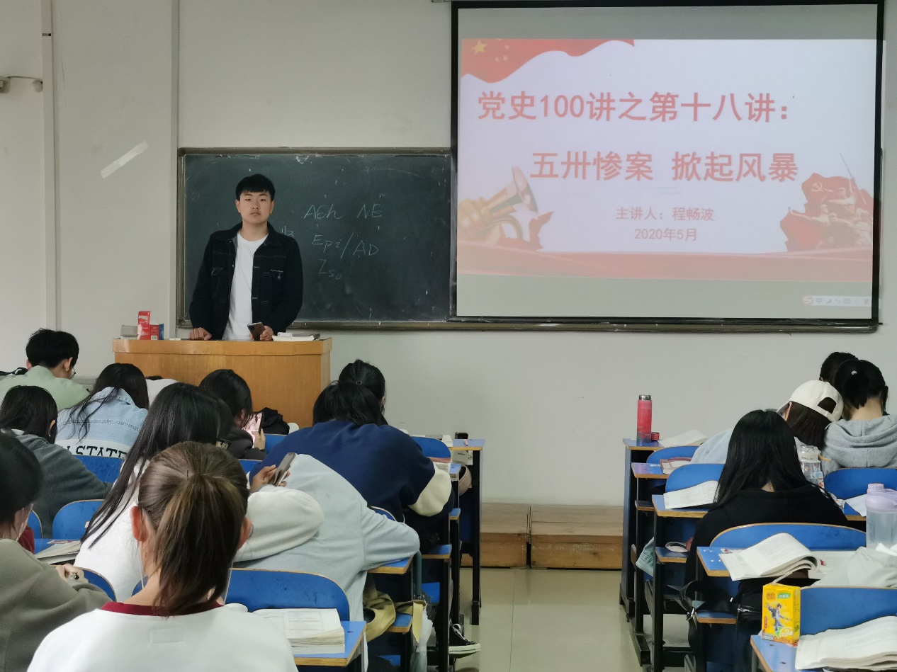 (文/姚明超 图/程凯)为激发十大外围足球平台官网 学子学党史的热情,带领全院广大团员青年深入了解党的历史,十大外围足球平台官网 特举办“凝聚青春力量,红色薪火相传”主题教育系列活动,在4、5月份持续进行红色基因进班级之党史100讲,通过一个个党史小故事的学习,带领同学们重温党史,感悟中国共产党一路走来的辉煌历程。2021年5月7日开展党史100讲之第十八讲:五卅惨案,掀起风暴。