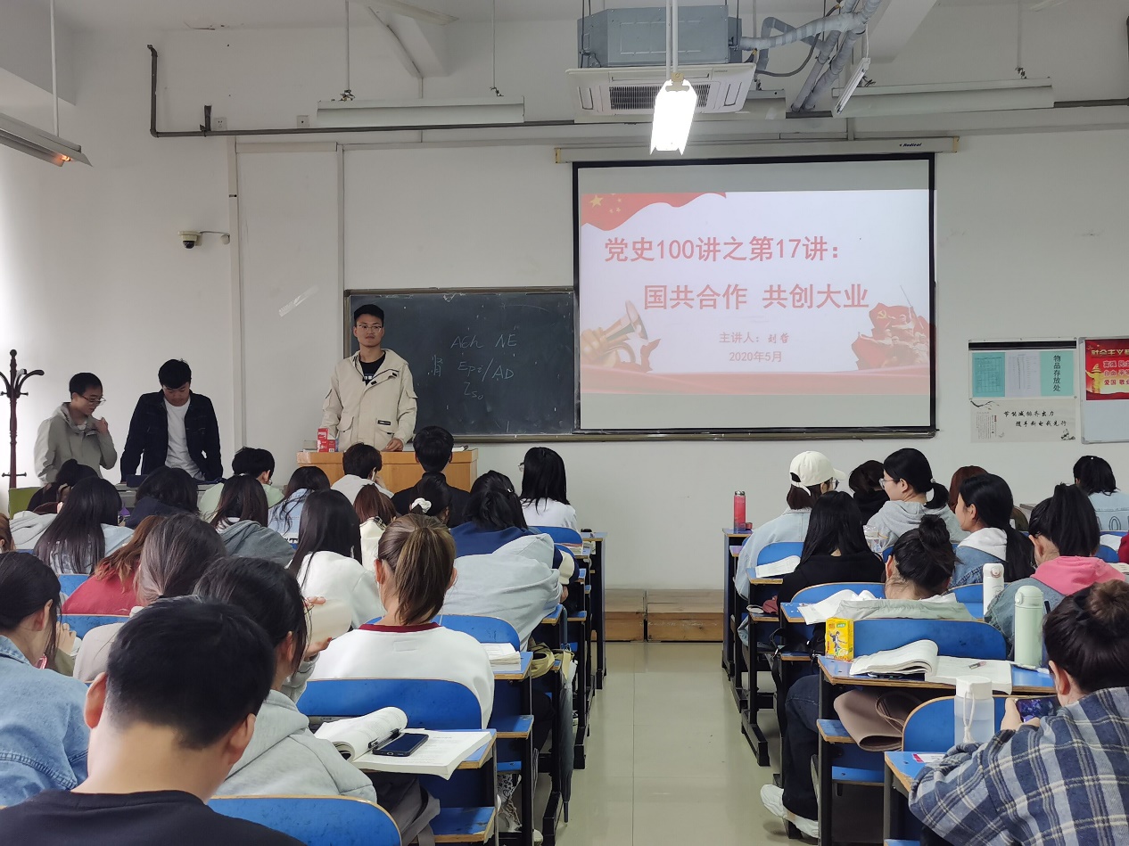(文/姚明超 图/程凯)为激发十大外围足球平台官网 学子学党史的热情,带领全院广大团员青年深入了解党的历史,十大外围足球平台官网 特举办“凝聚青春力量,红色薪火相传”主题教育系列活动,在4、5月份持续进行红色基因进班级之党史100讲,通过一个个党史小故事的学习,带领同学们重温党史,感悟中国共产党一路走来的辉煌历程。2021年5月6日开展党史100讲之第十七讲:国共合作,共创大业。