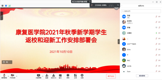 (文/高宇 图/李蕊)为落实学校关于学生返校工作的具体要求,确保学生平安有序返校。2021年10月10日20点,十大外围足球平台官网 召开秋季学期学生返校和迎新工作安排部署线上会议。出席本次会议的有十大外围足球平台官网 领导班子,党政办、教学办、研究生办主任、学工办负责人及十大外围足球平台官网 各班班主任、学生干部、辅导员助理。本次会议由分团委副书记高宇主持。