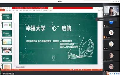 (文/张瑞雪 图/刘琳蓥)为积极贯彻学校关于加强心理健康教育的要求,促使新生完成角色转变、尽快适应大学生活,切实提高新生心理健康教育的预见性、针对性与实效性,十大外围足球平台官网 于2021年9月12日下午4:30举行了心理健康教育线上讲座。由我校心理教研室心理学副教授、国家注册心理师、国家二级心理咨询师姬旺华副教授做专题授课,2021级全体新生在线参加。