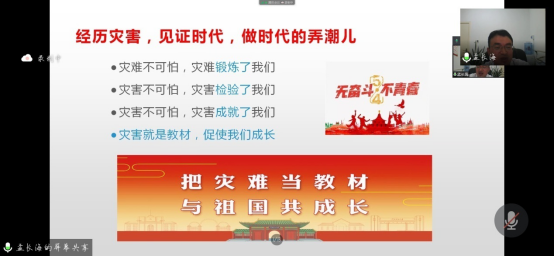 课堂上,孟长海副书记首先回顾和介绍了今年“7.20”特大暴雨对郑州以及我校东明校区造成的危害,对疫情防控工作进行了介绍。他结合自身经历和感受用丰富的图片和实例从社会各界大力支援、师生同心共抗灾、抗疫情、守护学校家园、榜样就在我们身边以及贡献自己的力量等五个方面生动讲解了抗洪救灾、疫情防控、守护家园的志愿者们的先进事迹。孟书记指出:灾难不仅是一次应急救援大考,更是一堂深刻的思政大课和一本鲜活的德育教材,它启示同学们,经历了灾害,见证了时代,要做时代的弄潮儿!青年大学生要把灾难当教材与祖国共成长,在灾情、疫情大考中,冲在前锋、担当奉献,用实际行动践行初心使命和诠释自身价值。