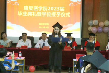 在激昂的国歌声中,毕业典礼正式拉开帷幕。师生共同观看了2023届毕业生视频及老师寄语视频,回顾了2023届毕业生在校的点点滴滴。刘斌副院长汇报了2023届毕业生及学位授予情况,孟长海副书记为获得河南省、学校优秀毕业生颁发证书,班主任程雪代表教师发言,希望同学们能够牢记厚德博学的校训,走好人生每一步。河南省优秀毕业生、2019级康复治疗学本科班徐韵婷回顾了大学学习历程,代表毕业生向母校和老师表达了真诚的感激。