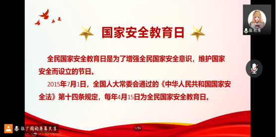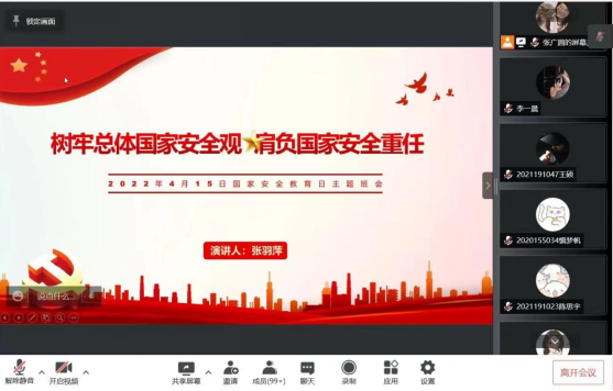 (文/张羽萍 图/李一晨)为树牢总体国家安全观,感悟新时代国家安全成就,并为迎接党的二十大胜利召开营造良好氛围,2022年4月15日上午11点50分,十大外围足球平台官网 以线上会议形式召开了“树牢总体国家安全观,肩负国家安全重任”主题班会。十大外围足球平台官网 2020级班主任孙岩老师、金小琴老师、白娟老师,2020级全体学生、2021级康复治疗学本科班学生参加了本次会议,会议由张羽萍老师主持。