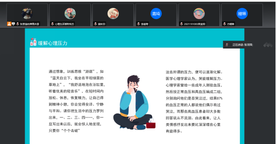 会议伊始,张羽萍老师为同学们讲解了心理健康的定义,及心理健康的四个标志。结合实际案例为同学们分析大学生心理健康状况,就当代大学生常见的焦虑、抑郁、易激怒、冷漠四种心理现状为同学们进行分析讲解。会议上张羽萍老师为同学们介绍了缓解心理压力的方法,鼓励同学们用读书,交友,专注做感兴趣且有意义的事情等方式缓解自己内心的压力。最后张羽萍老师给同学们提出了几点建议:重新塑造自己的形象、多走进图书馆、敢于在公共场合说话、正确认识孤独。